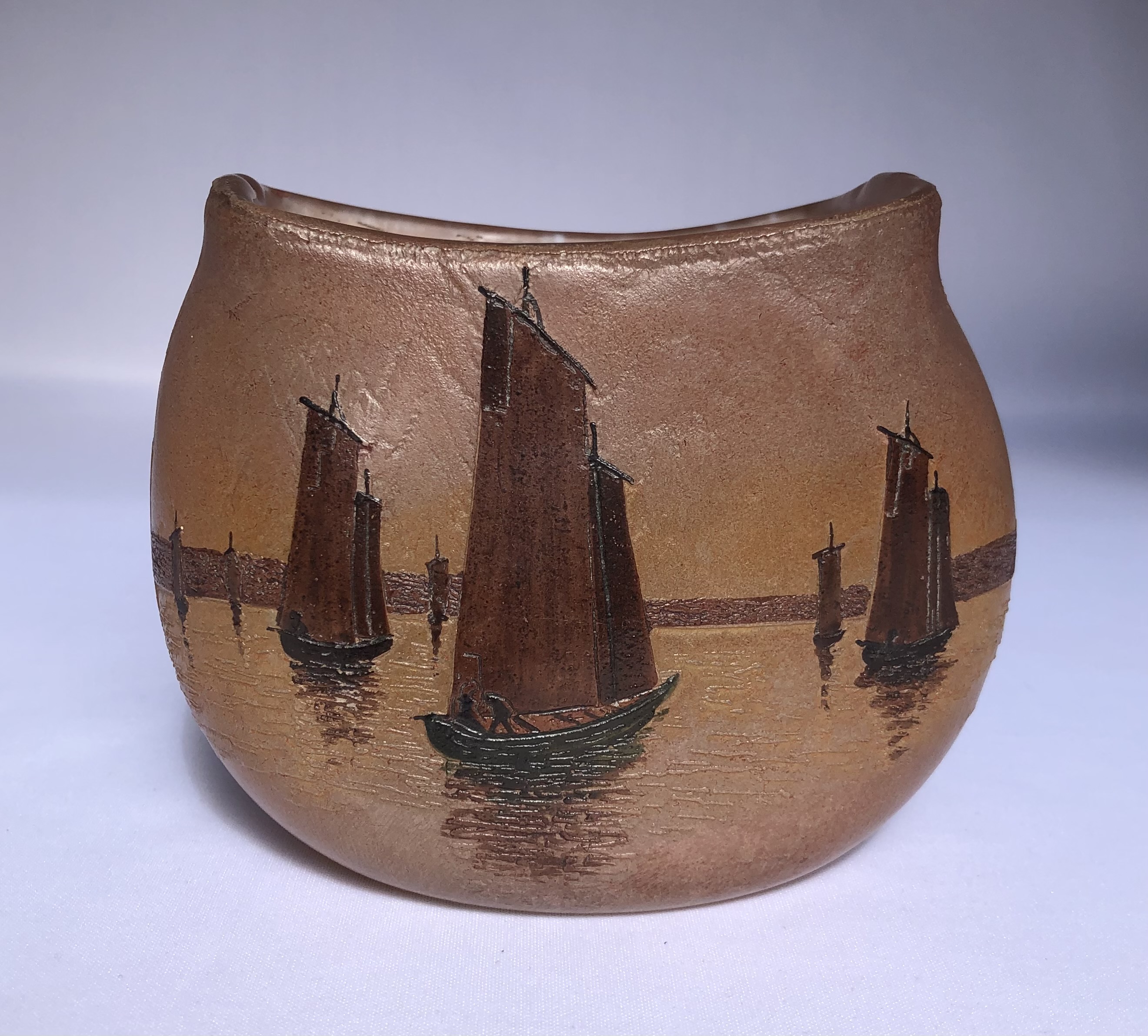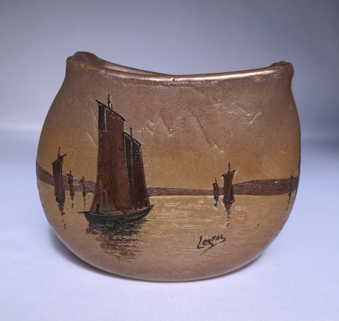 Vase de la série Pornic à panse aplatie, à décor gravé à l'acide de voiliers au soleil couchant. Vers 1900/1910.