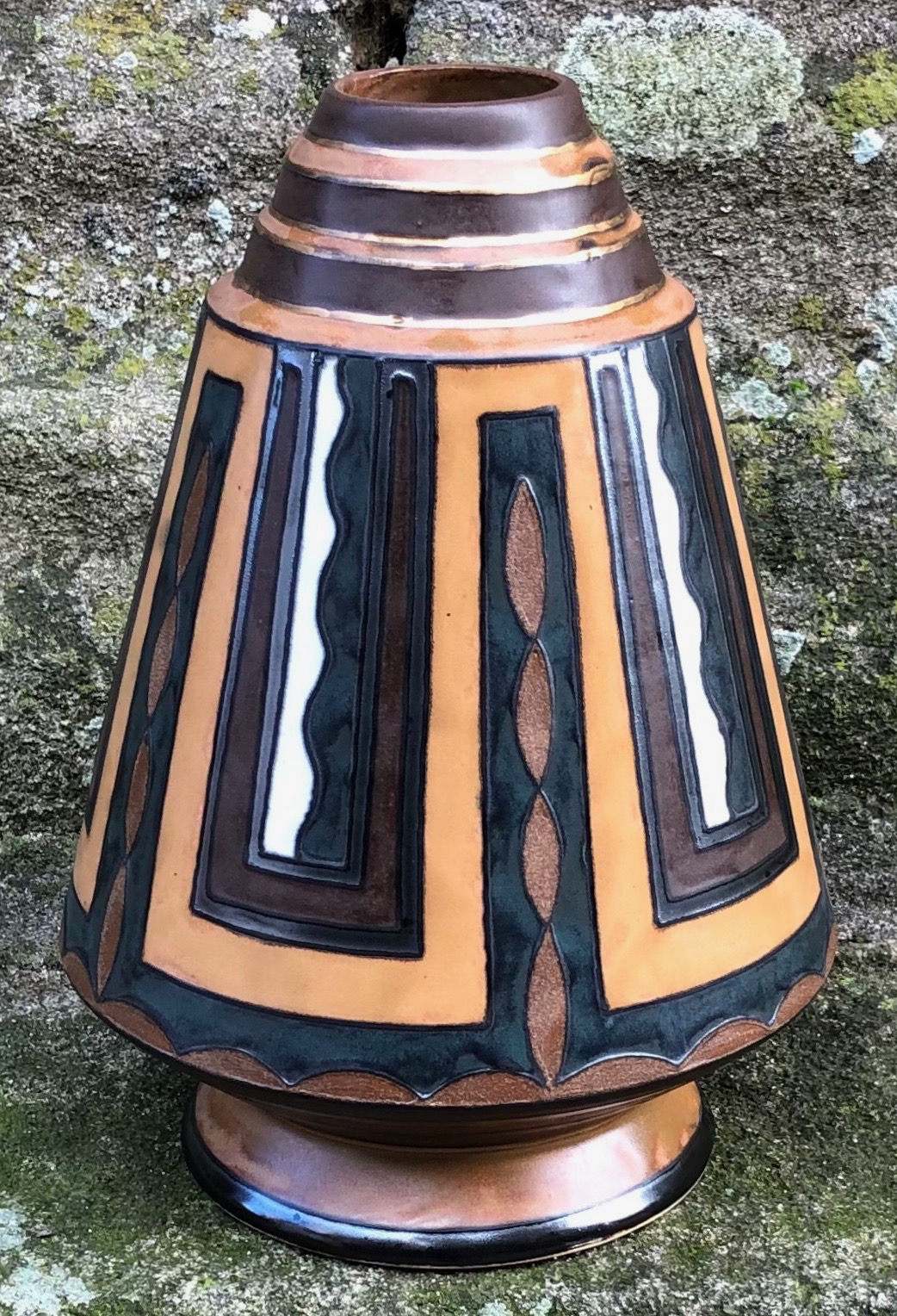 Grès polychrome avec rehauts d'or sur le col, vers 1925. Vase de la période Odetta. Hauteur 31 cm.