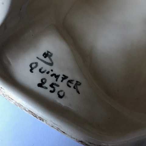 Faïence polychrome. Vers 1940. Rare vierge non marqué de son auteur mais répertorié par Antoine Maigné dans son ouvrage sur l'art sacré. Une petite saute d'émail sur le voile arrière de la vierge restaurable sur demande.