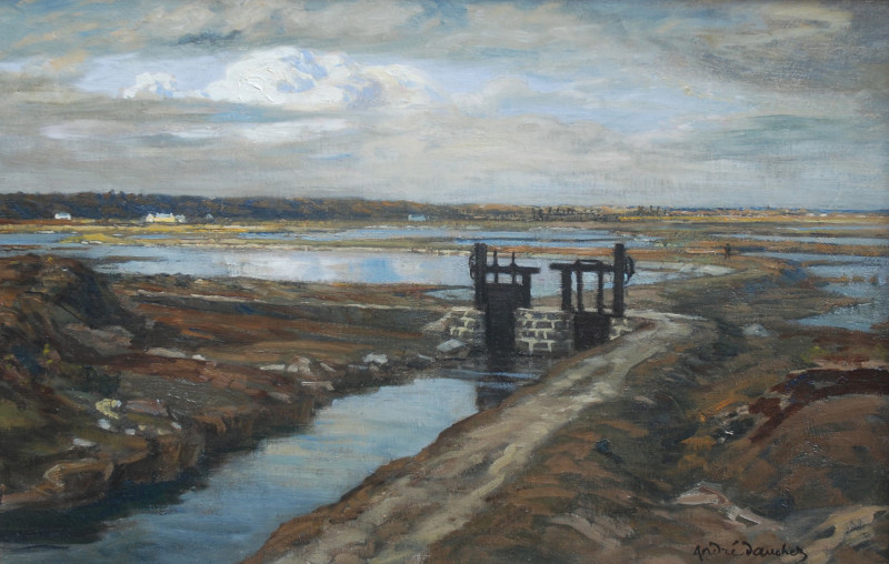 Huile sur toile. Information très gentillement fourni par la famille Dauchez : ce tableau porte le N°103 de son catalogue et est daté de 1904. Ce motif a été repris en dessin, esquisse, étude et dessin teinté. Une peinture plus grande que celle proposée ici a été exposée à la Société Nouvelle, au Salon de Nantes et au Musée du Luxembourg en 1905. Il n'est pas situé. Mais deux avis concordent pour la rivière de Pont l’Abbé sur la rive de Loctudy : Les viviers d'une poissonnerie ?