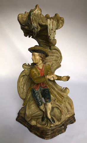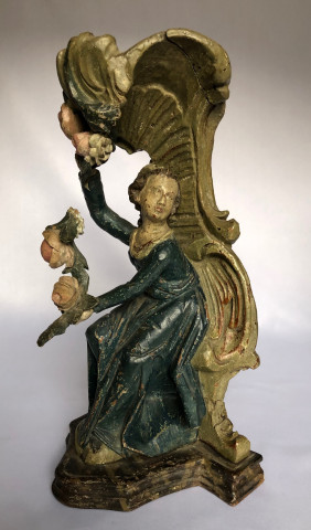 Polychrome wood. 18th century. Spring is represented by the woman with the birds in the nest, summer by the woman and her garland of flowers (one flower is missing from the garland), autumn by the man with the water basin (the basin is missing), winter by the man with the cannon evoking the cannon shot of January 1st. Old restoration on the back of the summer sculpture.