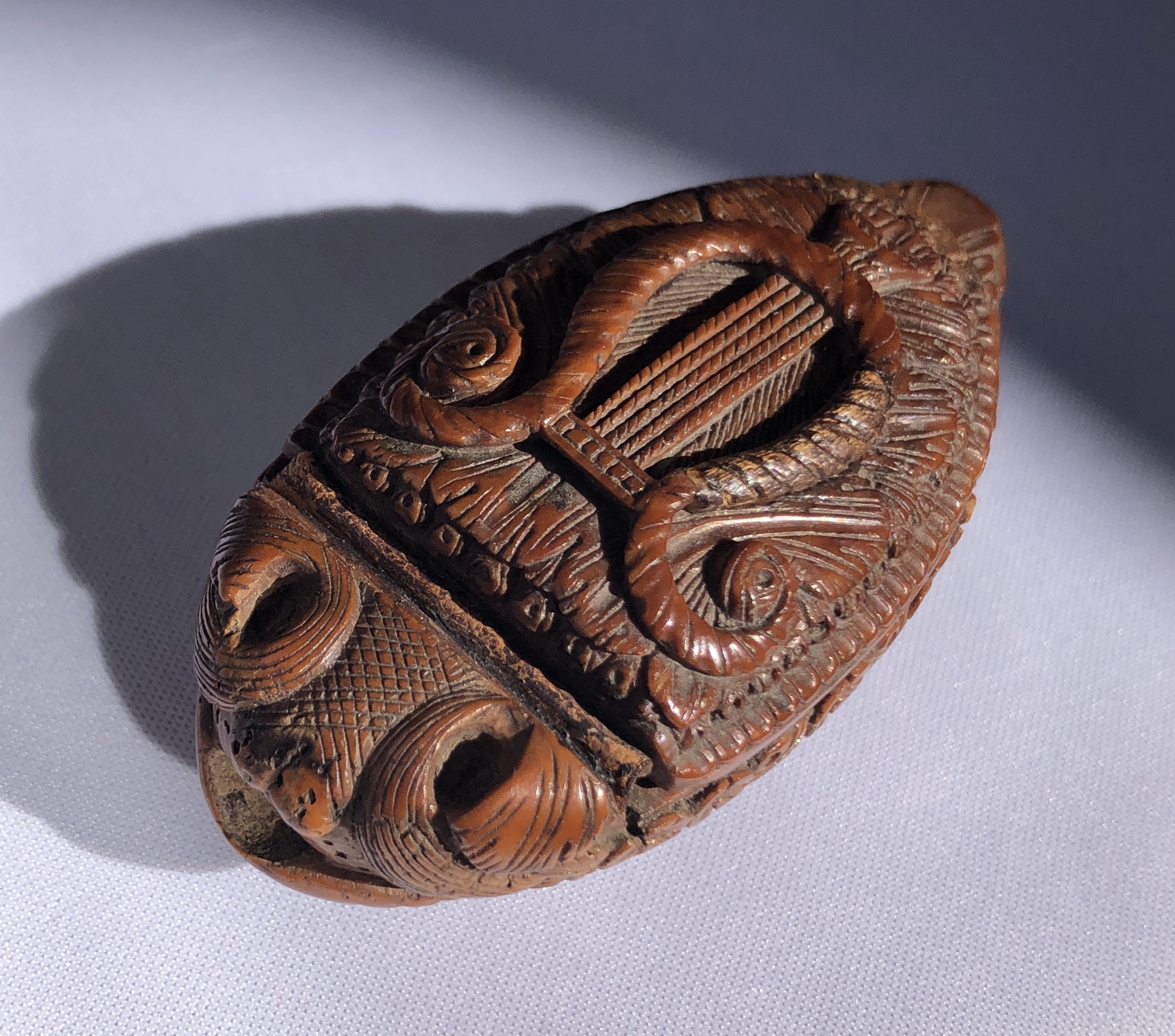 Back to the list Oblong Snuffbox With Muzzle Head And Lyre And Flower Decor Dimensions Lenght 3.35 in Price 240,00 € Details Corozo nut, first half of the 19th century. This object interests me